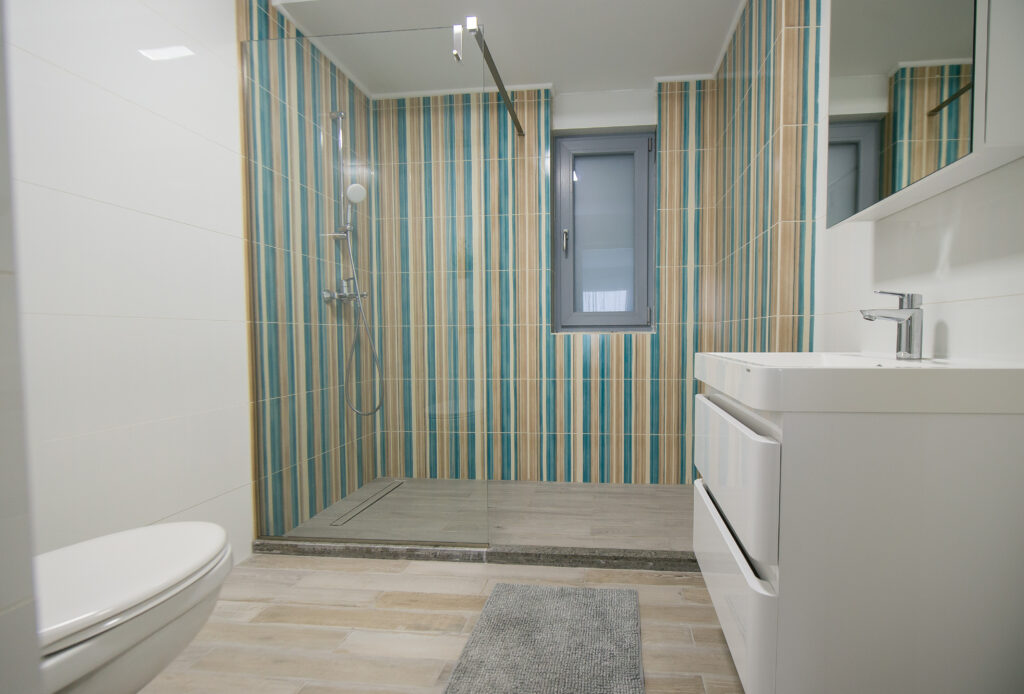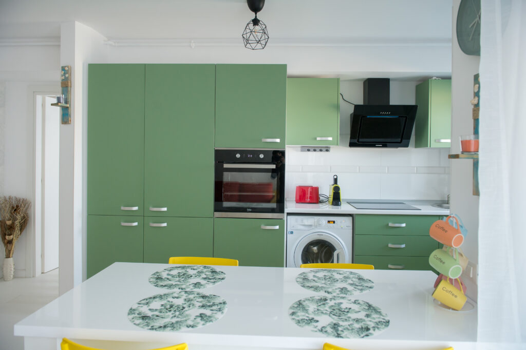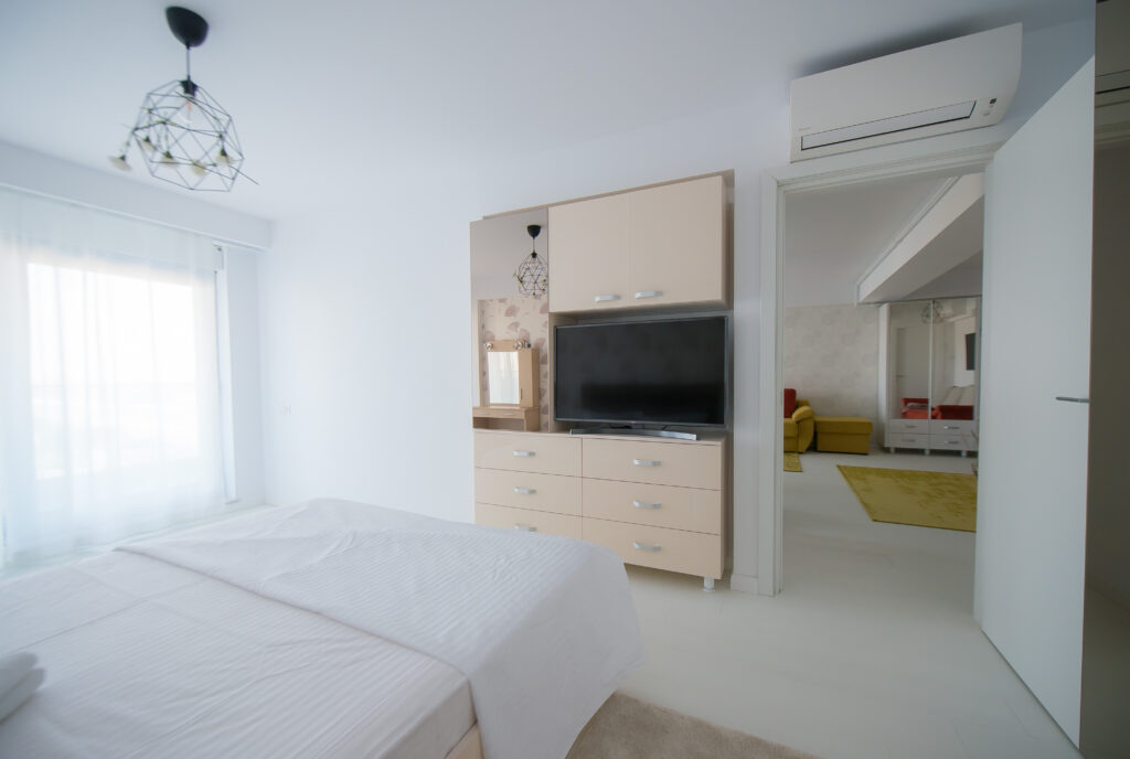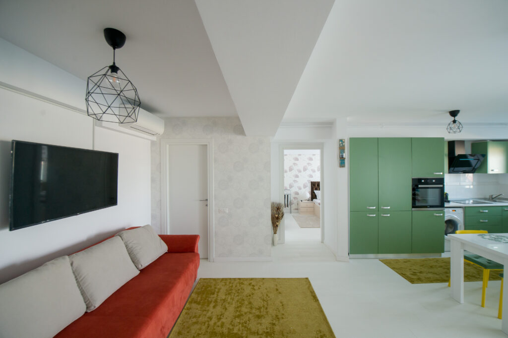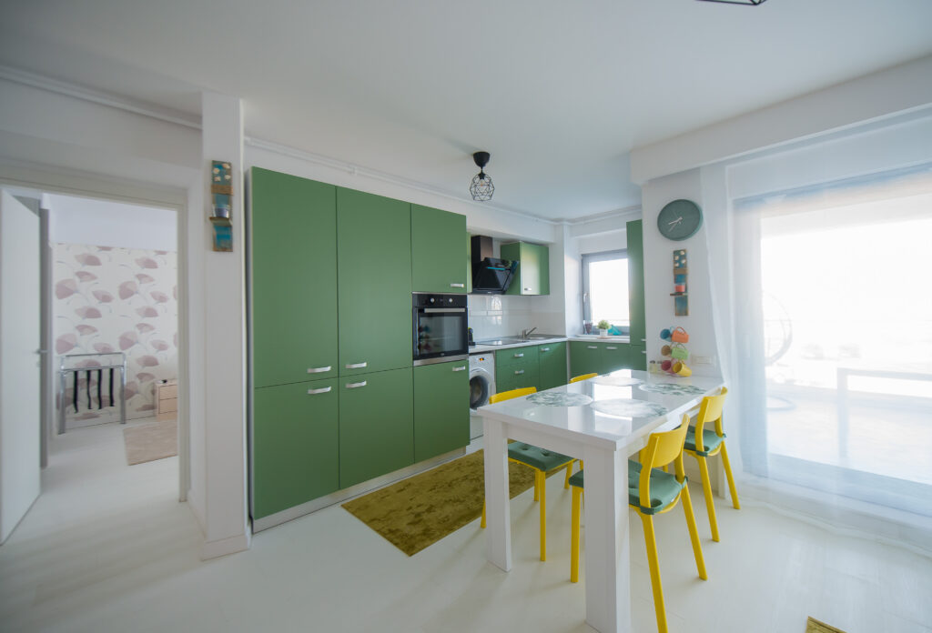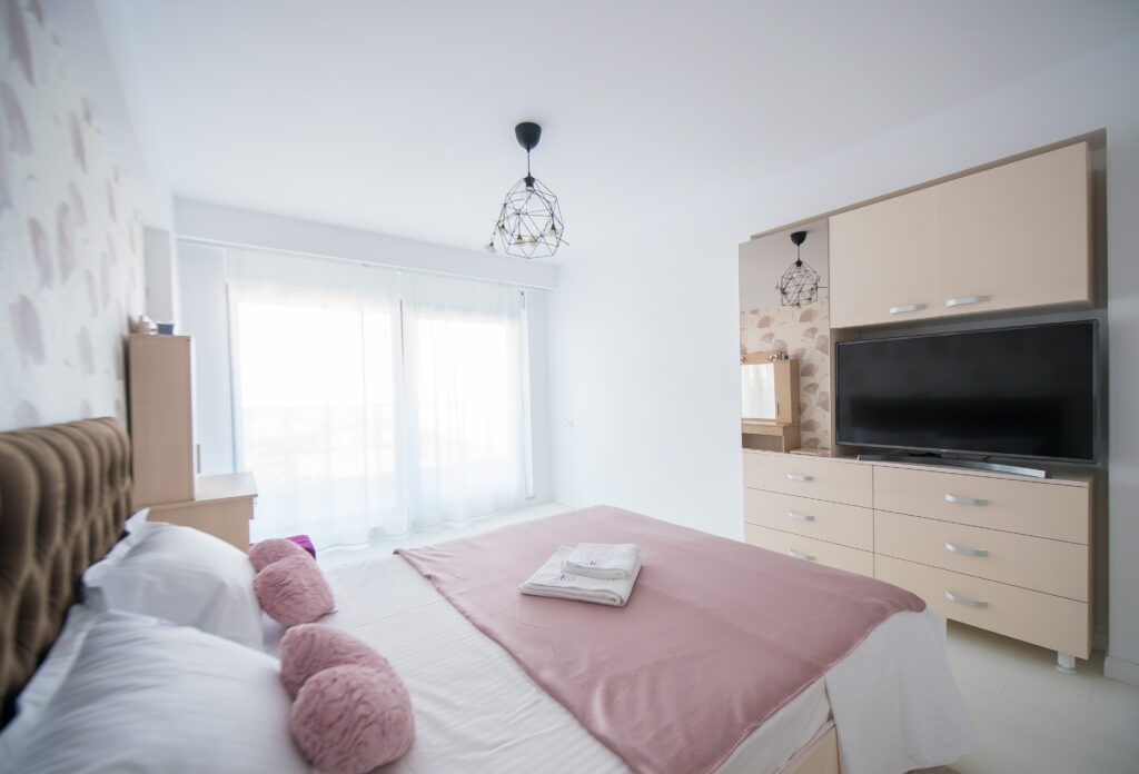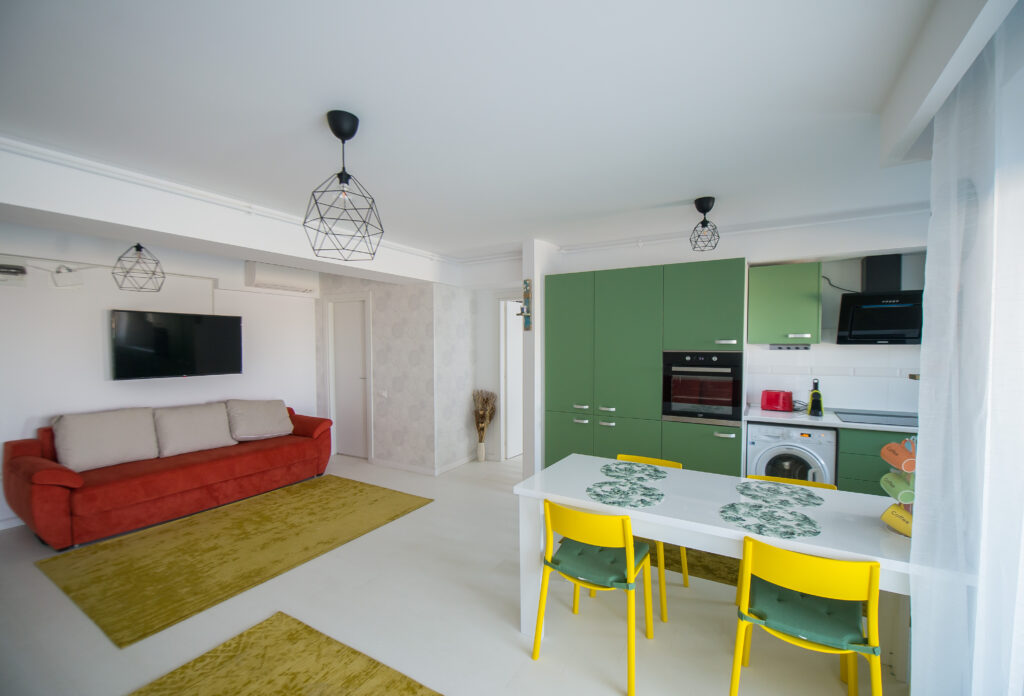 Apartamentul este complet mobilat și utilat modern, oferind un dormitor cu pat matrimonial și baie proprie. În living, se găsesc două canapele extensibile pentru confortul oaspeților. De asemenea, există un dressing și aer condiționat în living pentru a face sejurul cât mai plăcut. Pentru divertisment, sunt disponibile 2 smart TV-uri. Bucătăria este complet utilată, iar baia dispune de o cabină de duș. În plus, pentru comoditate, apartamentul are o mașină de spălat rufe și oferă conexiune Wi-Fi gratuită. Pentru momentele de relaxare și admirarea priveliștii către mare, aveți acces la o terasă amenajată atât în living, cât și în dormitor.
